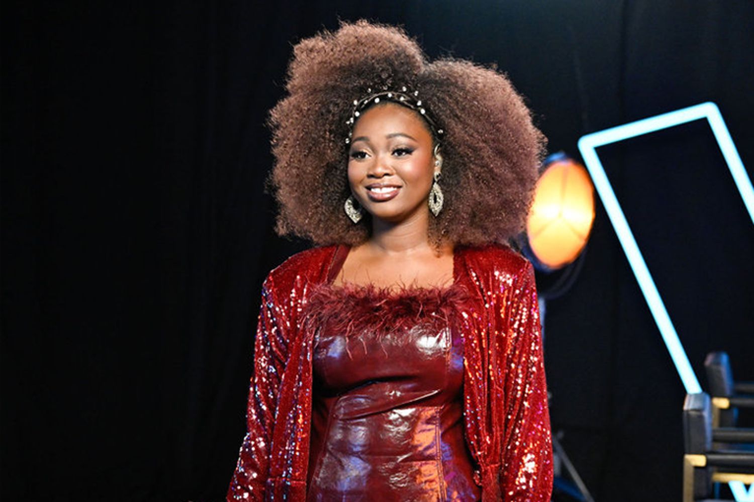 Alexia Jayy singing on stage with a group of people on The Voice Season 29 Episode 8.
